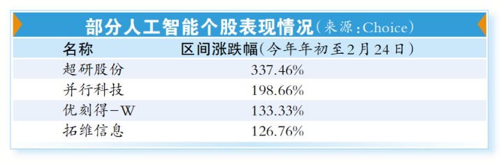 在资本市场,人工智能备受资金青睐。Choice数据显示,今年以来,截至2月24日,全市场约有600只人工智能个股,超八成取得正收益,超研股份、并行科技、优刻得-W等多只个股涨幅超100%。人工智能个股的走高,带动相关主题基金净值增长,同期,全市场200多只人工智能主题基金均取得正收益,约40只基金收益超20%。